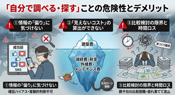 情報収集が容易になった反面、一般の方が自分だけで家づくりを進めようとすると、以下のような3つの落とし穴にはまりがちです。