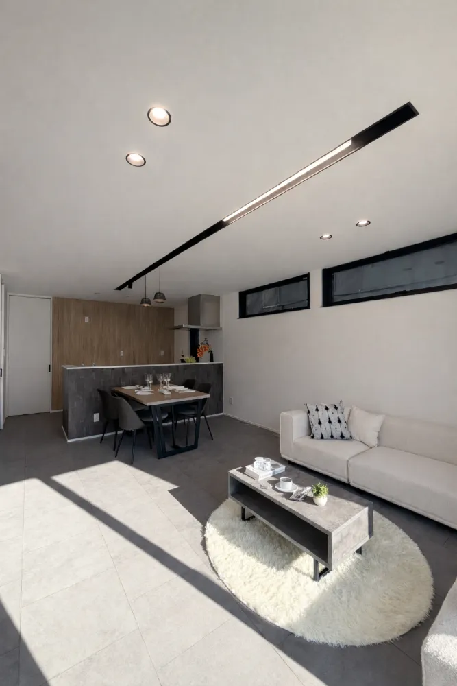 グレーのフラットな素材の外壁に黒の外壁を組み合わせたシンプルな外観の2階建てです。
