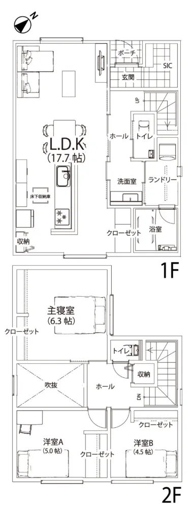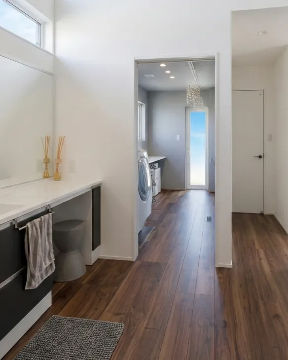 玄関から洗面室・ランドリー・LDKへとぐるっとつながる回遊動線。 水回りをまとめた家事ラク設計で、忙しい共働き世帯の暮らしをスムーズにする間取りです!