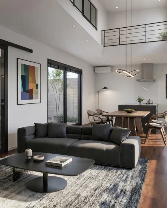 ダイニングの上には、2階のホールとつながる大きな吹抜けを配置。家族が自然と集まる、心地よいリビング空間です。